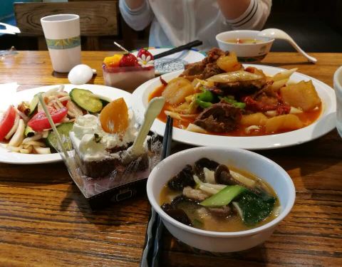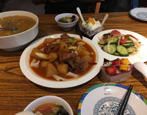 撒拉汤面片:适合冬天吃,暖暖和和的,里面有木耳、洋葱、羊肉、芹菜等,很暖胃,面片软硬程度正合适,口感不错。 干果酸奶:干果不是碎的,全是整个的腰果、杏仁等,干果都很大,吃着特别爽,不是很酸,桌上也贴心的放了蜂蜜自助舔加。 特别喜欢他家的餐具,都很漂亮。 唯一缺点就是桌子上擦的不干净,希望能改进。