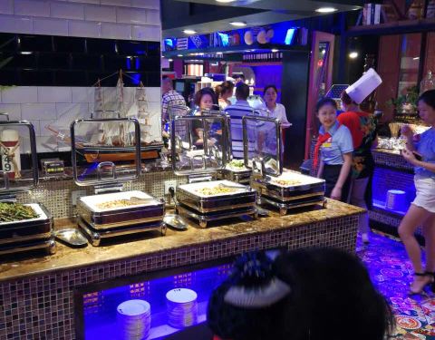 人太多了!菜品种类很多,很吸引人。然后各种甜点,生鱼片,熟食,海鲜有,虾,蟹,扇贝等等,然后,有很多类似生蚝这类的,都是烤熟了自己取,但是,人太多了,都要排队,如果慢了,基本上你就拿不到了。总体感...