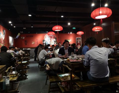 这家的牛油锅底感觉真的是蛮辣的,刚开始吃不觉得,越到后面越辣。 店里的座位还是蛮宽敞的,偶尔偶尔会要等座,上座率还属于比较高的,周末饭点时候会要等座。 菜的分量都很大,而且价格便宜,像土豆,只要四块钱,也有一大盘。像牛肉羊肉,一上来就是一大份,让人目瞪口呆。 调料着实一般,没什么心意,而且偏甜。 豆腐类制品不是非常好吃,譬如冻豆腐,不知道是用多嫩的豆腐冻的,完全没有get到冻豆腐那个点。还有炸豆皮,我的天,久煮都是那么硬。 服务还是可以的,冰淇淋还能吃吃,西瓜么续盘有点慢,还算是甜的。 偶尔可以吃吃,尤其是想拔草的店要排长龙的时候,性价比还是颇高的。