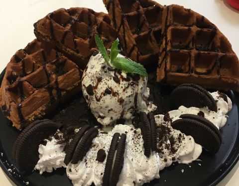 布朗尼冰淇淋华夫饼和曲奇薯薯,很大份,曲奇薯薯是用薯泥做成曲奇的样子,还不错
