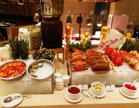 这家餐厅倒是来吃过几次了,开始不行,后面改进,越来越好。上个月生蚝主题来吃过一次,满意度相当不错,所以这次趁着蟹主题的时候过来试试。 事实证明还是没有让人失望。具体说说吧。进门是巧克力喷泉和酒水,以及水果冰淇淋。水果里面喜欢菠萝。对面是甜品,有招牌的榴莲芝士,还有拿破仑等。味道都不错,拿破仑很酥脆,里面的蛋白层略粘牙。 里面的餐台,正中间是翘脚牛肉,应该是秋冬季节的应季产品,汤头一般,比起正宗的还是有一定差距。然后凉菜方面,芥末木耳比较喜欢,板栗蜜枣也不错。钵钵鸡一般。 汤里面,鸡茸粟米羹味道倒是比较可口,意大利素菜汤也还行,赞一个。 再往里就是热菜。热菜里面有葱姜蟹,有沙茶闷蟹,都还属于比较好的。红烧江团好吃,可惜里面两条吃完就换成了龙利鱼。龙利鱼的香煎配柠檬汁也还不错。其他的红酒烩牛肉等算是中规中矩的了。咖喱蘑菇的咖喱比较淡。烤灯推荐档的香辣大闸蟹不错,都是母蟹。 最里面的是刺身海鲜和铁板,面档。刺身很一般。海鲜有红毛蟹,帝王蟹,面包鞋,三点蟹等。另外有鲍鱼。质量比较参差不齐,开始的好,后面略不新鲜哦。烧烤档点的羊排太肥,小黄鱼将就吧。烤生蚝比起上个月的生蚝差太多,好失落。。。 送了两只大闸蟹,不错。芝士焗小青龙略粉了哦。 服务相当满意,整体不错,值得回头。