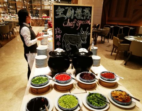 入住酒店三天 前两天为了赶行程只能在行政酒廊用餐 最后一天安排了好好享用8楼味Table全日制的早餐 环境自然是不用说 宽敞的桌椅 装潢大气 服务都非常主动 餐点很丰富 除了万豪标准的一些自助美式早餐 欧陆式 中...入住酒店三天 前两天为了赶行程只能在行政酒廊用餐 最后一天安排了好好享用8楼味Table全日制的早餐 环境自然是不用说 宽敞的桌椅 装潢大气 服务都非常主动 餐点很丰富 除了万豪标准的一些自助美式早餐 欧陆式 中式点心等 还有当地特色的面档:红油馄饨、红烧牛肉面、担担面、臊子面 还有现煎铁板小牛排 不可错过