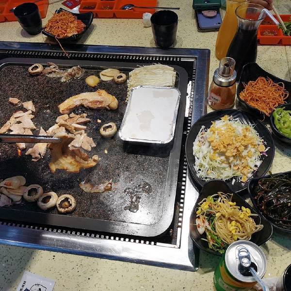 搜点评来的这家,位置不太好找,12点之前到的,等位半个多小时,美团团的2人套餐,又加了一份梅花肉,和孩子三口人吃正好。领班送了一大杯橙汁,烤肉师操作很专业,猪五花很嫩推荐。大酱汤太咸了,希望改进。