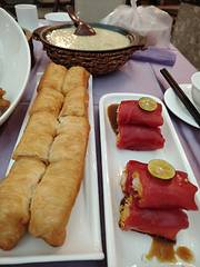 排骨蒸芋头、小酥肉、牛肉丸,都是我喜欢的南宁邕江宾馆阳光城早茶美点,芋头很粉,排骨嫩滑,酥肉香酥中带辣。再要白粥、油条、红豆卷等等,很丰富啦。