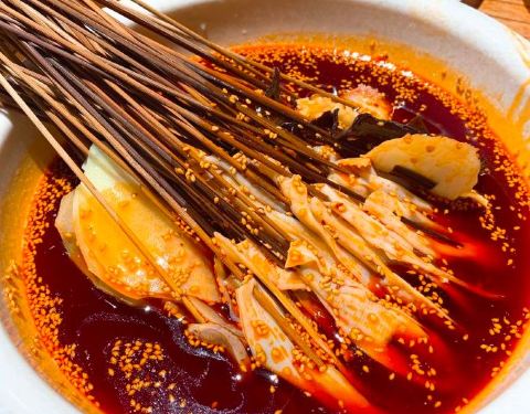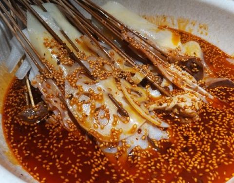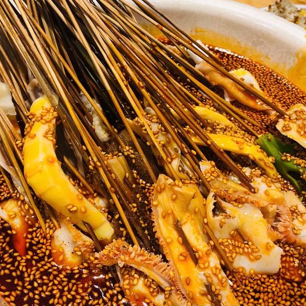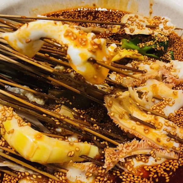 上周和同事来了个建设路拔草游,把建设路万人坑附近几家中午营业的网红店踩了。 叶婆婆从乐山来,在成都也开了几家,味道和乐山的差不多,红油属于甜辣型。十一点过一点点到的店,店里面也基本都坐满了。看来人气旺,翻台快。 菜品干净,我们采用的是把签签儿上的菜全部抹下来的方式,让菜和红油底料充分接触。完全浸润汤料的菜非常好吃,辣味、甜味恰到好处,加上一点点捆芝麻的干香,非常喜欢! 唯一不地道的,钵钵鸡出现了牛肉,传统的钵钵鸡是没得除鸡外的其他肉类,看来是进去成都后入乡随俗了,不过牛肉比鸡肉好吃,叶婆婆的鸡肉切的小方块,太柴,不入味,建议用手撕鸡的做法。 这次因为还要去踩其他店,吃得不多,也没尝试小吃类,下盘再来
