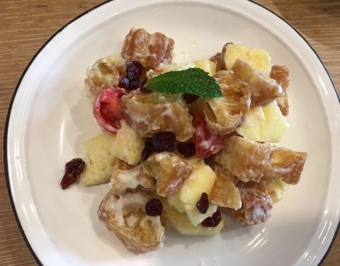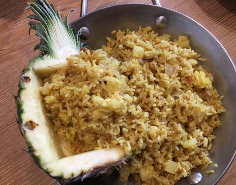 住在朝阳广场,逛了南宁的三街两巷,来到畅游阁赏了南宁母亲河的邕江,本想尝尝南宁的特色菜,无意中经过这家小馆,有想品尝的欲望,结果人还挺多,门外等候拿号吧;四人点了几样,这招牌菠萝炒饭还确实好吃,芒果慕斯是我最爱,总之色香味俱全,不错。