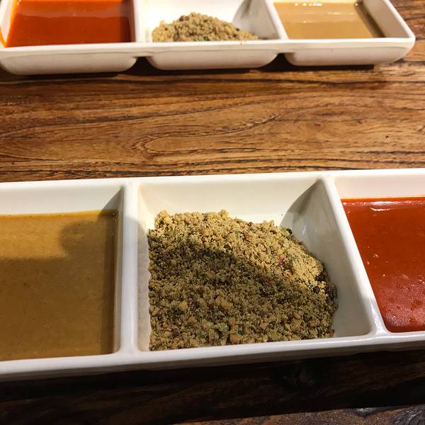 不会做西餐的甜品店不是好烤肉[嘿哈]他家颠覆了我对烤肉店的认知。没有烟熏火燎,不再是只有男人们的据点,羊肉和孜然不再是好cp!这里的烤肉借鉴了西餐中香料的选用,羊肉配薄荷,鸡肉配香草和蔘芭酱,卤肉饭和罗勒烩饭做的也超棒!关键是价格超便宜,人均60多。