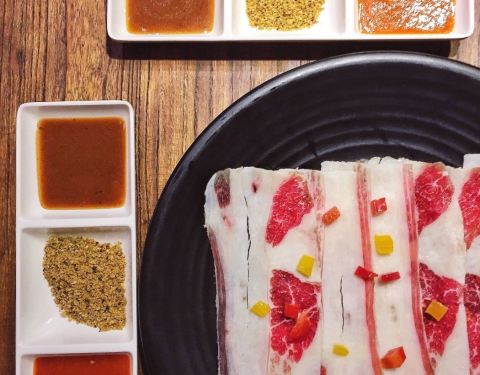 增一烤肉 ✨地标:西湖道32号增1号万维花园底商 素有美食天堂的白堤路各种美味云集,只要你想的到都可以在这里找到。 ✨特级霜降雪花牛:就像名字一样,好像肉上覆盖了一层霜一样,纹理层次分明的牛肉就是从从澳洲空运过来的特级澳洲谷饲雪花牛,感觉三分熟时蘸上黑椒酱的口感最好,肉比较鲜嫩多汁。 ✨法式小羊排:一份有三块都是经过腌制的,在炉上烤的滋滋作响,肥瘦相间但并不腻口,也没有明显的膻味,蒜香口味很好吃~ ✨秘制大葱烤鸡肉:吃惯了蒜味鸡肉的一定要试试用香菜和葱提味的鸡肉,一样好吃呦~ ✨烤海星:第一次尝试吃烤海星,据说这个是可以养胃的,从每个角里挖出来的肉肉蘸上搭配好的日式酱汁口感微腥但可以接受。 ✨一米特级肥牛&酸汤:他家的肥牛真的有一米那么长,可涮可烤,由于更喜欢涮的所以点了酸汤开涮,一看就是熬了很久的汤底,不是那种会看见整个西红柿那种的番茄锅,西红柿都已经熬烂了和汤融为一体了,里面还有酸黄瓜和小米椒,喜欢酸辣口的可以来尝啊~ ✨香煎龙利:本来龙利鱼肉就软糯无刺儿再加包裹上一层鸡蛋蛋液入口就更鲜嫩爽滑了~ ✨五味烤肉:顾名思义当然是五种口味啦,罗勒,芥末籽,黑椒,辣酱和叉烧~ ✨翅片:比鸡腿肉略肥,这个就是蒜香味的啦~ ✨梅森沙拉:酸甜口的酱汁里放了黄瓜,圣女果,玉米粒,很清爽的一款沙拉~