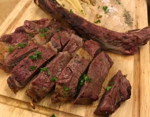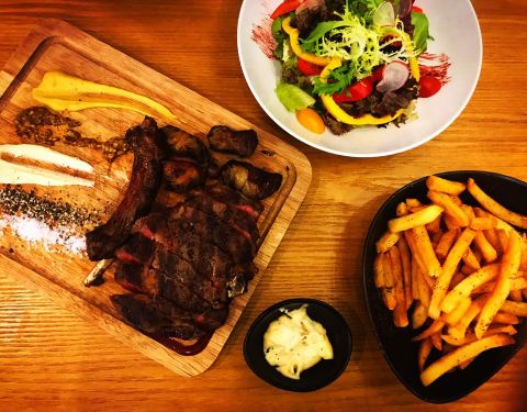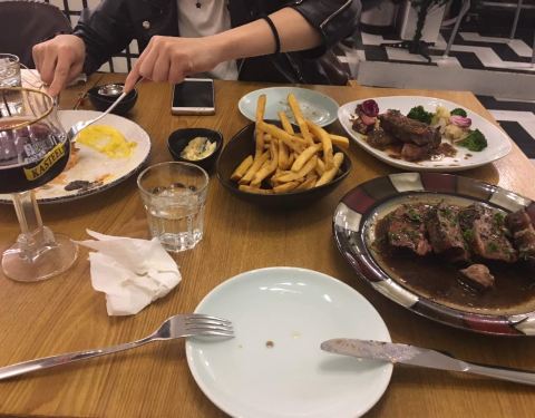 看网上评价很高慕名而来,走到门口发现没有人,然后开始回忆起之前某点评第一名的日料简直不想去第二次了,纠结了很久最终进去了。吃了之后发现真的是惊喜,肉分量很足,味道也很好。点了红酒牛排,足足炖了18个小时,非常嫩,红酒完全融入其中,口感爽滑!T骨牛排下次我一定要3分熟!口感很好,很香,摆盘也很不错!吃了就想打包的薯条,的确不错,大根的薯条,炸得恰到好处,外面脆脆里面软软的!即使凉了口感也没有差太多没有很软。兴起想喝一杯但是怕喝不完一瓶红酒,恰好隔壁也是这种情况,于是大家愉快的拼了一瓶!店里的帅哥服务很好,没有其他店的冷漠和过度热情,你刚好需要,他刚好送到!给予合理建议,很nice!还会来第二次的!