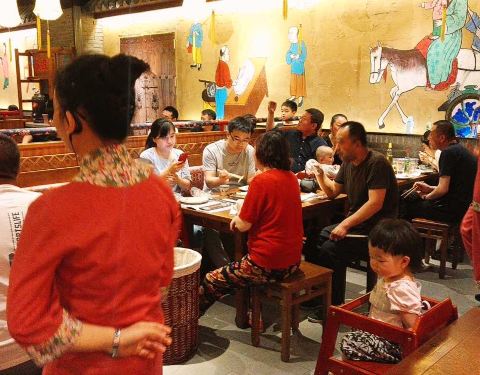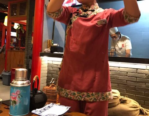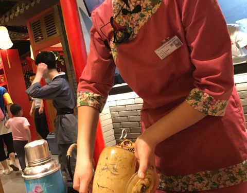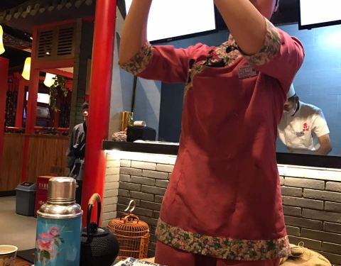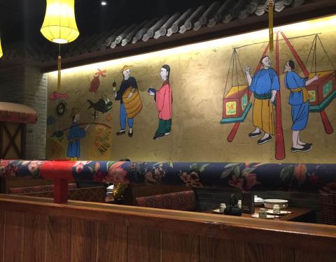 带着孩子一家三口去的海悦店,因为是周日人好多,提前手机上糯米预约的,等到我们了安排到靠近厨房的地方,油烟味特别重。服务员都很疲惫似的,爱理不理,点的家常土豆丝,招牌京酱肉丝和烤鸭,春饼一套半(本来点的一套服务员非说不够再让点的半套)小米粥一碗。环境大家都大概知道啥风格了,说说菜吧,这是我吃过有史以来最难吃的土豆丝,半生不熟,还没我在家炒的好吃:@京酱肉丝的酱和肉丝没有粘合度吃着水汲汲的:@再说说他家号称限量的烤鸭吧,58元半套,先不说价钱,烤的那是嘛和嘛,吃了不到十片肉,柴的咬不动都吐了5.6片,还有店家请问葱很贵吗?半套烤鸭给那么点葱丝,实在无力吐槽,虽说吃的是特色是环境,但是菜品品质也太糊弄人了。哦,还有那个春饼,那哪是春饼啊,就是小烙饼,太油了,一套春饼就够吃了,服务员非要让多要半套。总之两个大人一个6岁小孩花了123块,老公怕浪费拼命地吃好歹进他肚子不少,性价比太太一般了,也就一次的事。