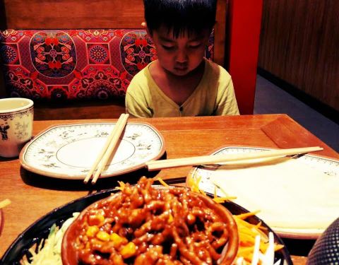带着孩子一家三口去的海悦店,因为是周日人好多,提前手机上糯米预约的,等到我们了安排到靠近厨房的地方,油烟味特别重。服务员都很疲惫似的,爱理不理,点的家常土豆丝,招牌京酱肉丝和烤鸭,春饼一套半(本来...带着孩子一家三口去的海悦店,因为是周日人好多,提前手机上糯米预约的,等到我们了安排到靠近厨房的地方,油烟味特别重。服务员都很疲惫似的,爱理不理,点的家常土豆丝,招牌京酱肉丝和烤鸭,春饼一套半(本来点的一套服务员非说不够再让点的半套)小米粥一碗。环境大家都大概知道啥风格了,说说菜吧,这是我吃过有史以来最难吃的土豆丝,半生不熟,还没我在家炒的好吃:@京酱肉丝的酱和肉丝没有粘合度吃着水汲汲的:@再说说他家号称限量的烤鸭吧,58元半套,先不说价钱,烤的那是嘛和嘛,吃了不到十片肉,柴的咬不动都吐了5.6片,还有店家请问葱很贵吗?半套烤鸭给那么点葱丝,实在无力吐槽,虽说吃的是特色是环境,但是菜品品质也太糊弄人了。哦,还有那个春饼,那哪是春饼啊,就是小烙饼,太油了,一套春饼就够吃了,服务员非要让多要半套。总之两个大人一个6岁小孩花了123块,老公怕浪费拼命地吃好歹进他肚子不少,性价比太太一般了,也就一次的事。