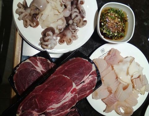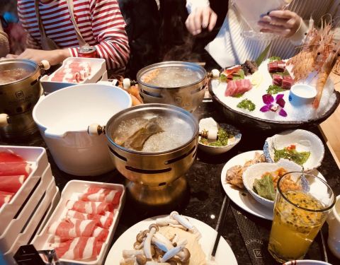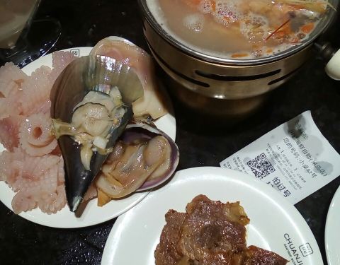 在招行的app上看到这家店参加周三五折的活动,139块钱一个人,果断跟小伙伴一起买了券,晚上过来吃饭。这家店很大,整个二楼都是他们家的。取菜区域分为两块,入口右转的这一片比较大,以各种海鲜,甜品,烧烤,涮菜,点心为主。而另一侧的取菜区域相对比较小,以各种水果,刺身,饮料,冷饮小食为主。两片区域重叠的菜品不多,所以一定都要转到。虽然说的是海鲜自助火锅,不过店家还是以各种虾和贝壳类为主,鱼,蟹等的选择比较少。火锅是那种单人小火锅,汤有两种,海鲜和麻辣的。我选了海鲜锅底,汤底在加入各种贝壳,虾蟹鱼等涮过以后,真是鲜得飞起来!!!因为我跟小伙伴只有两个人,为了能吃到更多的品种,我们很多菜品都只取了一份,然后分着吃。这家店的服务也很好,收盘子,倒垃圾,加汤都非常勤快,除了烧烤区,因为是现烤的,所以需要排队等待以外,其他地方都是随便拿。另外每张桌子上都会根据人数,送一份刺身拼盘,不过品质当然没有办法跟日料店的比,所以刺身类我基本上都放到锅里烫熟了再吃。以139块钱一个人的标准而言,这家店真是性价比超赞的!!!而以原价278块钱的标准来看,这家店就只能算普通了。