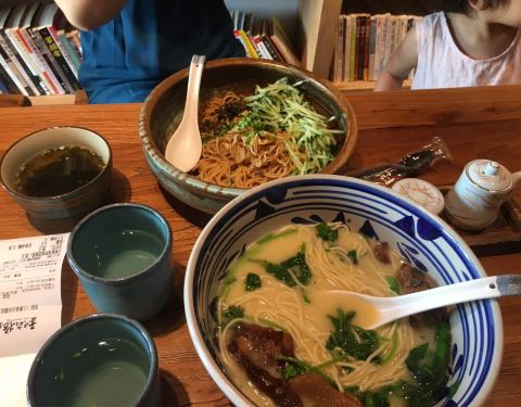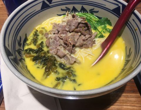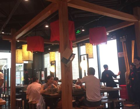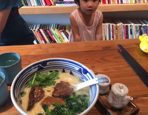 环境不错,可以免费加面,有很多小食可以选还送免费柠檬水,汤很浓,很有营养,服务态度也不错,实木的桌子凳子高高的红灯笼,书架上还有书可以看,总体不错,貌似有点小贵