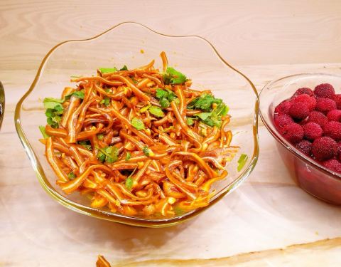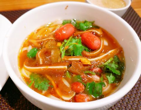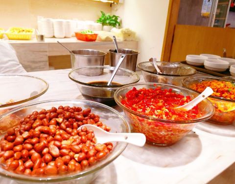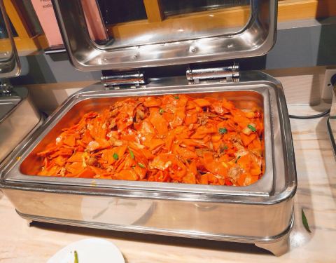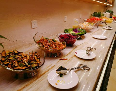 位于圆通酒店四楼的老湘食我是去吃了顿自助早餐。早餐7点钟开始,有团队在这里用餐就显得拥挤了些,其实人少的时候看街景再吃个早餐还是挺不错的。餐厅布置的还是挺清新的,一排书架做隔断,架子上有绿萝做装饰。沙发座卡式座位都挺舒适的。这里的早餐品种别说还挺多的,有炒菜,西点和面食。从豆浆、油条、鸡蛋、小麻球、馒头和稀饭到西式咖啡,牛奶、果汁,蔬菜沙拉和面包。蒸笼里还有玉米,紫薯等粗粮。各种水果一字排开,柚子、冬枣、西瓜总有一款你喜欢。咱遵循吃多少拿多少的原则走到面档摊请阿姨帮我烫一碗米粉,里面放点生菜和辣酱,其他自助辅料也不少,再加一撮香菜夹几片炒顺风、2个迷你烤肠,一碗热腾腾的下肚,又辣又鲜,里面的汤水鲜美无比,一口气又吃又喝吃的碗底朝天,热汗直流,爽!这顿自助早餐丰俭随意,适合大众口味,吃的饱饱挺好的。
