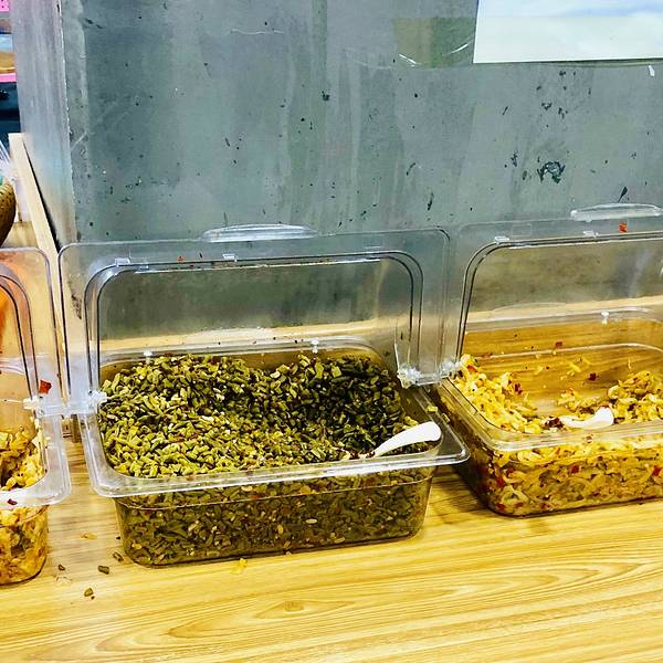 长沙米粉魅力确实很大,十点钟去还在排队抢座位,这家叫易裕和的生意好得过分,有很多人端了米粉蹲在路边吃也愿意为之买单,如果要加各种臊子的话价格并不便宜,相当于买一份十几块的米粉再炒一个菜,三四十很轻松。 各自买了单把老旧的牌子依次排在两个顺序牌子上,分开吃面排队还是吃粉排队,叫号后再去领取自己的,再加入泡菜、萝卜干之类。 我叫了辣椒炒肉臊子再加肥肠,一碗粉里面臊子占了大部分,确实味道很浓郁,肥肠感觉处理没有想像那么软糯。