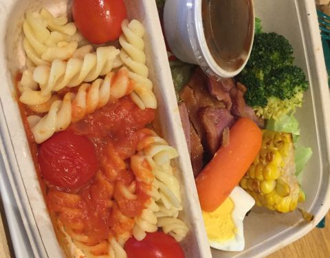 ...尼尼,还有蛋糕甜品,这份盒饭还是不错的,有青菜,还有鸡蛋,加热后吃味道不错,还有意大利面、真棒