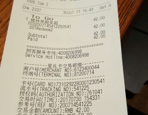 不过味道不错,吃完晚饭,正好去去油腻,感觉星巴克还是很重视品质的,红茶都给的大杯装,还可以多次续杯