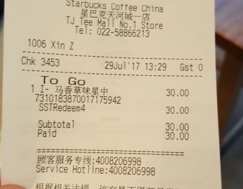经常来的一家星巴克,这次来没有买咖啡,买的红茶喝,划重点....,红茶,袋装的....不过味道不错,吃完晚饭,正好去去油腻,感觉星巴克还是很重视品质的,红茶都给的大杯装,还可以多次续杯....挺好的尝试,以后...