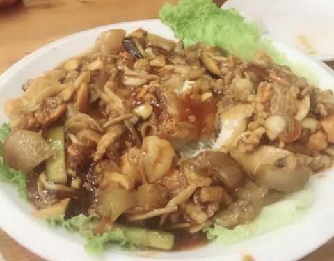感觉自己好久没吃炒菜了,于是上这家来尝尝,中午人还挺多的,差一点就要等位了!事实证明两个人又点多了,菜量比较大! 蟹黄包,12元一份,一份六个,清晰可见的蟹黄和鸡蛋,还有脆脆的荸荠! 素烧茄子,还好吧,没有外面的肉烧茄子好吃,中规中矩的烧茄子味! 黄焖两样,要的小份的,上来一大盘…真的好实惠。(部分菜品都可以点小份的,经济实惠) 糖醋里脊,酸甜适中的里脊,每一小块吃到嘴里都有扎实的肉感!不像某些地方都是面糊炸的吃不到肉。 八珍豆腐,老天津菜吧,这家口儿略微重,配米饭吃正好,各种爽滑的蘑菇,搭配海鲜和鸡肉,值得推荐的一道菜!