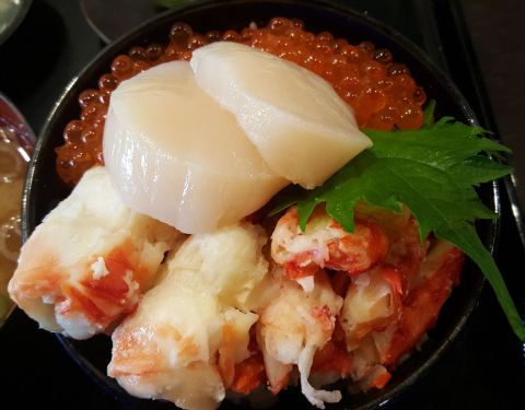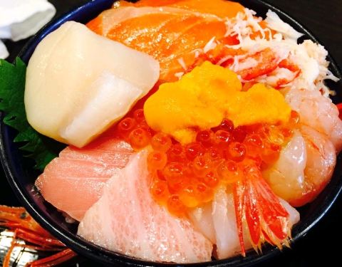 原本估计在非高峰时段的15点左右到店内用餐,没想到一般的座位竟然客满!只好坐下放有挖洞的日式座位。一看菜单,没想到竟有花咲蟹和金枪鱼等30种以上的盖饭!虽然每一种看起来都很好吃,不知道该选哪一种?但果...