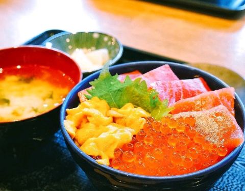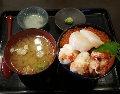 原本估计在非高峰时段的15点左右到店内用餐,没想到一般的座位竟然客满!只好坐下放有挖洞的日式座位。一看菜单,没想到竟有花咲蟹和金枪鱼等30种以上的盖饭!虽然每一种看起来都很好吃,不知道该选哪一种?但果...原本估计在非高峰时段的15点左右到店内用餐,没想到一般的座位竟然客满!只好坐下放有挖洞的日式座位。一看菜单,没想到竟有花咲蟹和金枪鱼等30种以上的盖饭!虽然每一种看起来都很好吃,不知道该选哪一种?但果然还是要选人气最高的「3色盖饭」。饭的部分可以选择白饭或是醋饭,这回选择的是白饭。