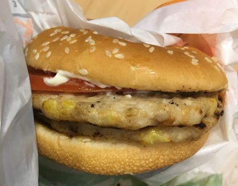 非常划算,九块钱的汉堡包,有猪肉鸡肉两种哈,到店里没有明显的标示噢!这回买的玉米猪排的