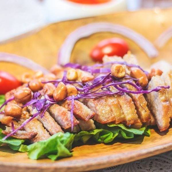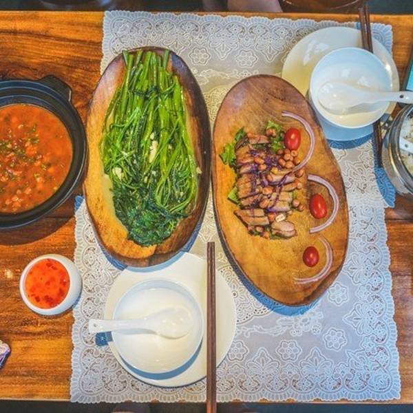 网红餐厅:梵丽酒店•明•泰国露台餐厅 地址:阳朔蟠桃路59号梵丽酒店•明•泰国露台餐厅 人均:80元 预定指南:露台需要提前三天预定!通过商家手机添加微信号预约,需要付100元的定金。 梵丽酒店及露台餐厅位于西街对面的半山腰上,隐匿在一条小巷子里,首先小巷子不容易找到,在新富安酒店旁边一条路上去,走到一半往左边的小巷穿进去,走的时候不要怀疑,放大步伐往前走,这是正确的路没错的。露台的位置需要提前三天卡座(通过商家手机添加微信号预约)很幸运地又捡了漏,能与傍晚共进晚餐。餐厅露台望出去就是西街,可以俯瞰西街全景。傍晚到达的时候,餐厅只有我们一桌,正好享受下静谧的用餐环境。除了露台的位置,这个在院子里的小单间也很有韵味。拍出来天然自带一种网红风我们点了份猪颈肉,这道几乎是来到泰国餐厅必点的菜式。华灯初上的时候,露台简直不要太美