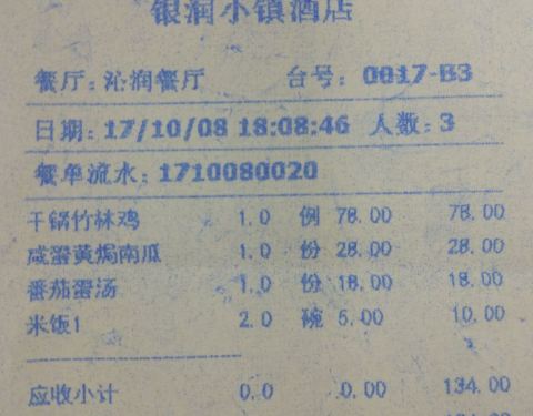 乐园附近没有餐厅,所以选择了在酒店餐厅用餐,开始还担心菜不够吃,味道不好,价格高。没想到完全超出预期,简直成了惊喜!可以用物美价廉来评价!我们两大一小点了三菜一汤,居然没有吃完,结账时候才一百多块钱,在这样的星级酒店真的很划算了。因为手机内存不够,菜的照片删了,幸好单据还在。