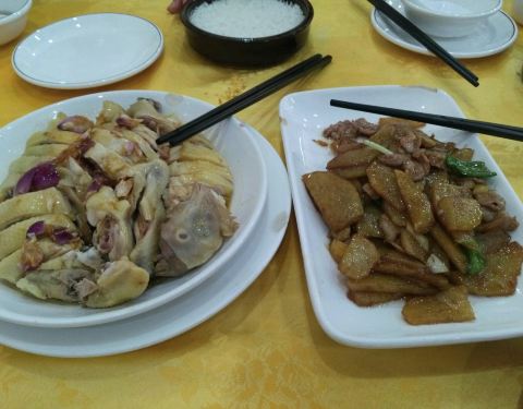 团购了3人餐。肉菜本来是鹅和鸡二选一,去了说只有白切鸡,份量挺大,没吃完;薯仔炒肉和茄瓜煲二选一,选了前者,挺入味的,肉片好吃;青菜选了炒菜心,还行;送的例汤是莲藕汤,挺好喝哦;饭也挺好吃。