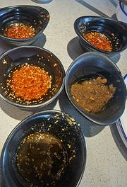 必吃榜味道确实还是不错的,去了两次都被排队吓跑,周六中午11:20左右到了,6人桌已经等位10桌了,大概等了一个小时,赶上第一波走顺利吃上。 服务员端了一盘子小料上来,我以为每个人可以选择一种酱料,没想到一个人就给配了五种。麻酱不同于老北京麻酱,感觉里面没有韭菜花和豆腐乳,更偏芝麻酱的口感很香偏甜。 海鲜汁和特色辣椒酱都特别推荐,辣椒酱很香。 涮菜味道上整体都很不错,除了毛肚有点腥,其他都没雷区。鸭血特别特别特别嫩滑,牛丸特别特别好吃,除了锅底自带的几个丸子,还有现场过来直接下丸子的,雪花肥牛也不错。相对来说,鲜牛拼比较一般。 最后的主食面很筋道,蘸着麻酱吃,完美结束大餐。