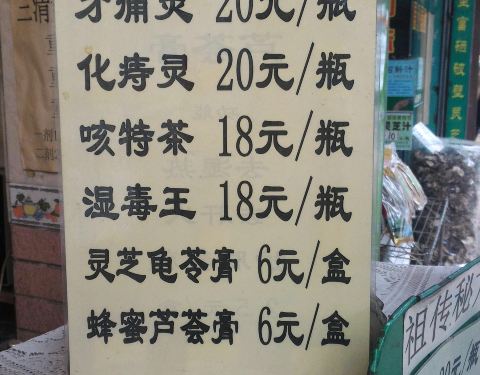 常常在同福路走过,也当然常路经这个店,有两次和LG买过了这里的凉茶,那时咳嗽,店里的阿姨建议我们喝“咳特茶”,18元一瓶,比较贵的,但据说是她们的独特配方,可是感觉效果一般般。 店里还有“牙痛灵”、“化痔灵”、“湿毒王”这这种治病类的凉茶,都是20元或18元一瓶的。 灵芝龟苓膏和蜂蜜芦荟膏都是6元一盒。 也有普通的清热、去湿类的凉茶,4、5元一杯。