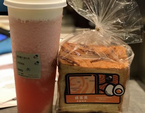 喜茶月光店,说来有趣,这家位于日月光广场泰康路上的喜茶店,也是我第一次听说喜茶这个品牌和见识喜茶超长排队队伍的地方。2017年2月,才进入上海市场的喜茶,现在可以说是遍地开花,由于,目前网上下单的便利,现场排队的人已经不多了。 点了这个月的当季限定款,他家的招牌茶:芝芝桃桃,和咸蛋黄千层吐司。