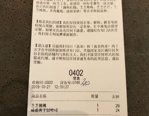 喜茶月光店,说来有趣,这家位于日月光广场泰康路上的喜茶店,也是我第一次听说喜茶这个品牌和见识喜茶超长排队队伍的地方。2017年2月,才进入上海市场的喜茶,现在可以说是遍地开花,由于,目前网上下单的便利,...喜茶月光店,说来有趣,这家位于日月光广场泰康路上的喜茶店,也是我第一次听说喜茶这个品牌和见识喜茶超长排队队伍的地方。2017年2月,才进入上海市场的喜茶,现在可以说是遍地开花,由于,目前网上下单的便利,现场排队的人已经不多了。 点了这个月的当季限定款,他家的招牌茶:芝芝桃桃,和咸蛋黄千层吐司。