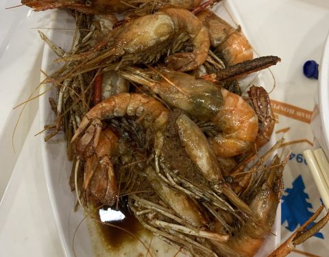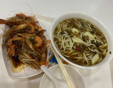 最爱医院食堂里的面档,至少在晚上2200前,还是能在大冷的冬夜,吃上一碗热乎乎的番茄牛腩面的。食堂面的品种很多,也可以换成同类型的年糕或米线。面条是手工面,吃起来有嚼劲;面汤偏油了一些;面料很丰富,大块的牛腩和番茄,黑红之上密布着绿色的香菜,美味!定价17元一碗,性价比足!图片是片儿川和油爆沼虾。