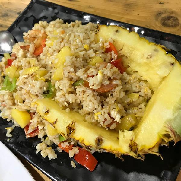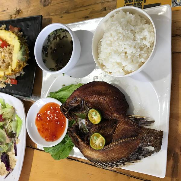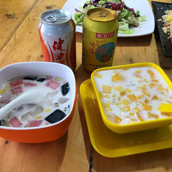 这是一家藏在海棠湾后海渔村的一家甜品店,距离海边不远处,它并不在我们的原计划之内,而是误打误撞到来的,一尝以后,眼前一亮,决定把它推荐给大家。店铺面积比较小,只有几张台,客源主要说住在附近民宿的游客,我们进来后,由于不够位置,两位快用餐完毕的老外主动让座。这里的价格比较亲民,价格都在30元以下,鲜榨果汁16元,最贵的菠萝饭也只售28元,也可能饥饿的原因,感觉比五星级酒店炒的还要好吃,火候恰到好处,每粒米饭都吸收了菠萝的香甜,而且份量充足,可以说是满分食品。煎鱼饭,是他们店铺的主打,由于烹饪方法问题,上菜速度有点慢,卖相一般口感也一般。海味五香卷,吃下去有惊喜的一道小吃,外脆内软,层次分明,沾点酱油更有口感。他们家的清补凉口味比较清淡,里面的料倒是不少,加入了众多果肉,如西瓜、芒果等,吃起来比较解暑。没想到小小的一家店铺,食品种类可以这么丰富,各式甜品都说可圈可点,榴莲班戟和椰汁糕都是大爱,后者的椰奶味非常浓郁,但不能多吃,否则会产生腻感。好不容易来到后海渔村,就想把这里的美食一次性品尝,毕竟因为村内修路而导致堵车半小时,和季叔叔誓要吃饱才能走,奈何眼大肚窄,这次真的吃撑了。 地址:海棠湾蜈支洲岛码头旁藤海小学对面渔村二巷内 营业时间:周一至周日09:00-23:00