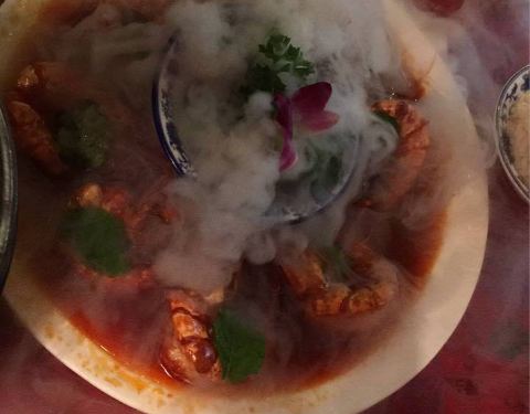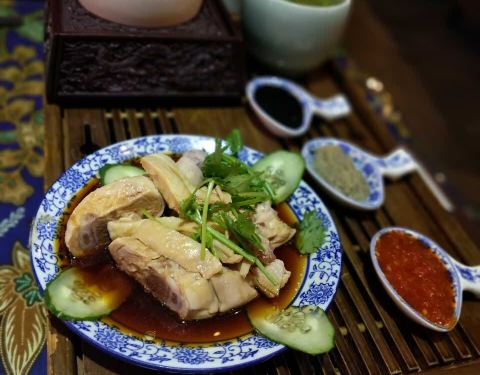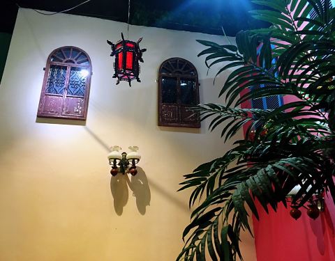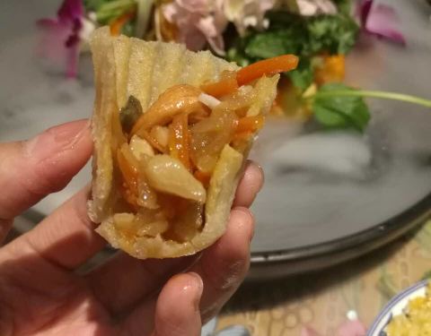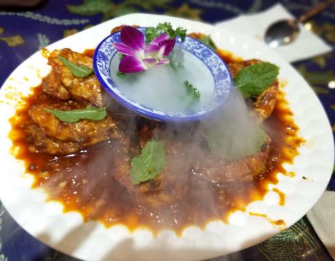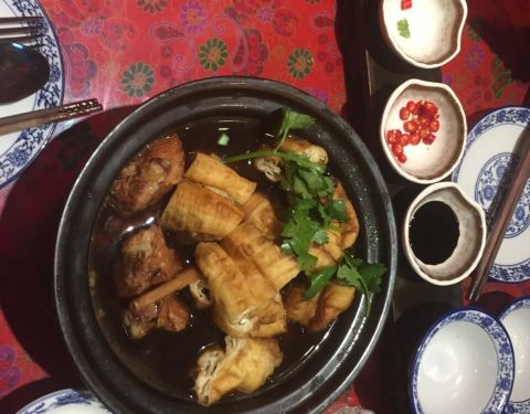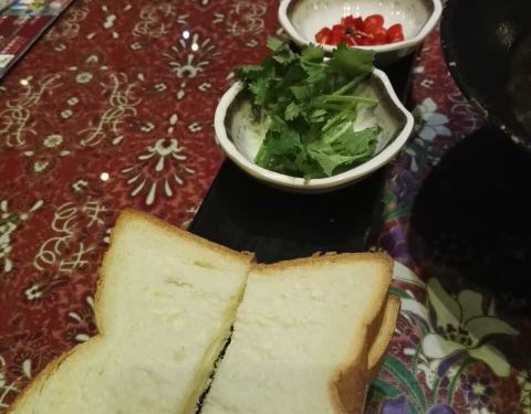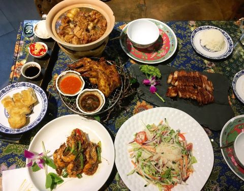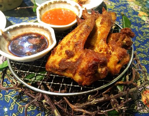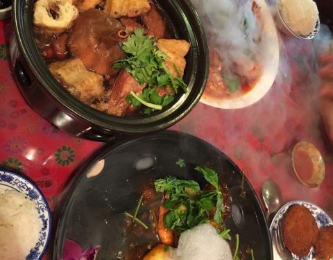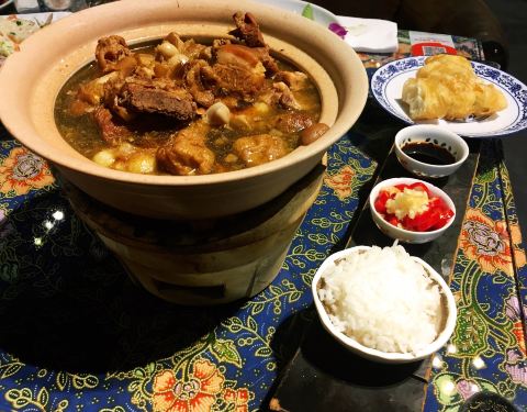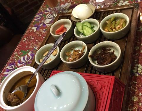 餐厅内部的面积其实蛮大的,举架特别高,就搭建出了一种森林般的感觉。几乎每个餐桌旁边都有一株椰子树,每一个餐桌的装修风格都是古色古香的。最喜欢他们家的吊灯,这种古色古香的宫灯一直是我的最爱。餐厅的中间部分竟然还有一个幔帐,还是挺有东南亚风格的。整个餐厅的墙壁都做成了窗户的形状,提高了餐厅色彩的明艳度。 『巴生肉骨茶』这是传统的东南亚菜,来之前特意查了一下,马来西亚传承的是我国福建的菜系,因此是苦中带甜。而新加坡传承的是我国海南的菜系,因此是甜辣口味的。茶其实是药汤,福建人忌讳说药而改说茶。砂锅炖煮,里面的食材很丰盛,包括猪排、猪肘、猪蹄、豆腐泡、油条,搭配米饭、酱料、辣椒和蒜。汤汁特别鲜美,平时不太爱吃米饭的我,都吃了整整一碗米饭。 『黑椒虾』摆盘中的这朵花,突然让我眼前浮现出别在少女头上的鲜艳的小花,黑椒虾稍微有些辣,甜辣的口感。 『娘惹烤翅』感觉这样三个烤翅都好大,微辣的口感,不细品感觉不到的微辣,蘸料有辣椒酱和调和酱料。 『蜜汁黑叉烧』餐具很有趣,是一个不规则的木板造型。这次的叉烧竟然以精瘦肉为主,很是惊艳,配上蜜汁,甜而不腻,很喜欢吃。 『酸甜蔬菜沙拉』在普通的蔬菜沙拉里加入了粉丝,更奇特的是加了山药,口感特别好,最开始我竟然以为是荸荠。 『洛神玫瑰茶』玫瑰红的颜色很是鲜艳,酸甜且偏酸的口感,解腻又好喝。