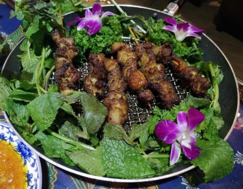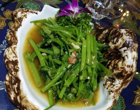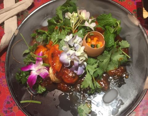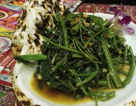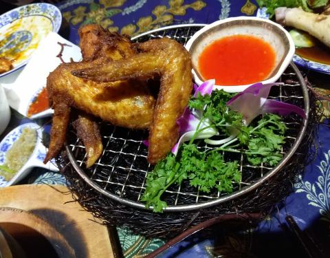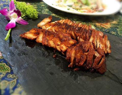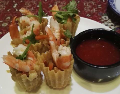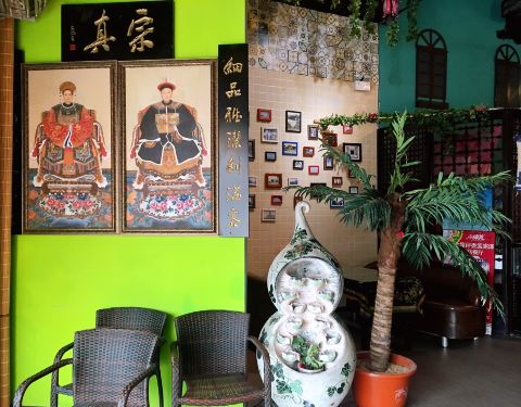 餐厅内部的面积其实蛮大的,举架特别高,就搭建出了一种森林般的感觉。几乎每个餐桌旁边都有一株椰子树,每一个餐桌的装修风格都是古色古香的。最喜欢他们家的吊灯,这种古色古香的宫灯一直是我的最爱。餐厅的中间...餐厅内部的面积其实蛮大的,举架特别高,就搭建出了一种森林般的感觉。几乎每个餐桌旁边都有一株椰子树,每一个餐桌的装修风格都是古色古香的。最喜欢他们家的吊灯,这种古色古香的宫灯一直是我的最爱。餐厅的中间部分竟然还有一个幔帐,还是挺有东南亚风格的。整个餐厅的墙壁都做成了窗户的形状,提高了餐厅色彩的明艳度。 『巴生肉骨茶』这是传统的东南亚菜,来之前特意查了一下,马来西亚传承的是我国福建的菜系,因此是苦中带甜。而新加坡传承的是我国海南的菜系,因此是甜辣口味的。茶其实是药汤,福建人忌讳说药而改说茶。砂锅炖煮,里面的食材很丰盛,包括猪排、猪肘、猪蹄、豆腐泡、油条,搭配米饭、酱料、辣椒和蒜。汤汁特别鲜美,平时不太爱吃米饭的我,都吃了整整一碗米饭。 『黑椒虾』摆盘中的这朵花,突然让我眼前浮现出别在少女头上的鲜艳的小花,黑椒虾稍微有些辣,甜辣的口感。 『娘惹烤翅』感觉这样三个烤翅都好大,微辣的口感,不细品感觉不到的微辣,蘸料有辣椒酱和调和酱料。 『蜜汁黑叉烧』餐具很有趣,是一个不规则的木板造型。这次的叉烧竟然以精瘦肉为主,很是惊艳,配上蜜汁,甜而不腻,很喜欢吃。 『酸甜蔬菜沙拉』在普通的蔬菜沙拉里加入了粉丝,更奇特的是加了山药,口感特别好,最开始我竟然以为是荸荠。 『洛神玫瑰茶』玫瑰红的颜色很是鲜艳,酸甜且偏酸的口感,解腻又好喝。
