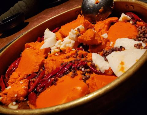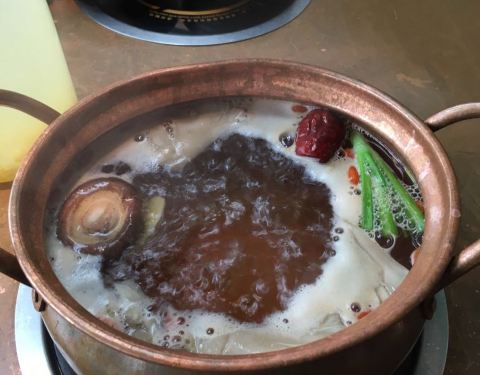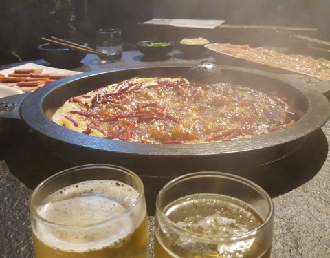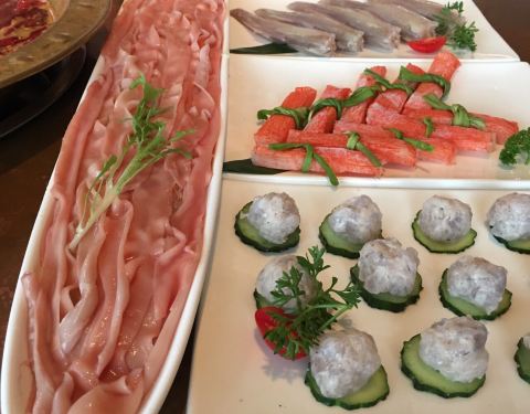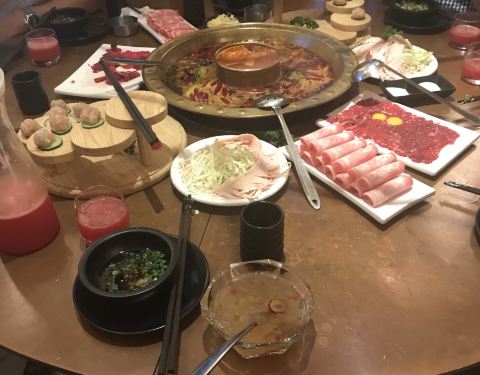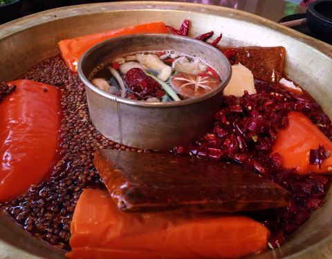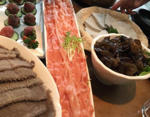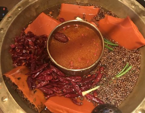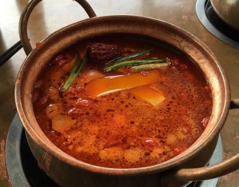 这店在我们入住的公寓附近,不远,步行可至。吃火锅的,也算是重庆火锅的一种吧。来到重庆的第一个晚餐当然要试试啦,我们到店的时候5点多吧,人不算多,想坐在外面露台的桌子,都说是给预定的。到店里临窗的位置,也都说给预定了,其他位置的共用大的也是留位的,沒法只能坐小锅的桌子,三人一人一小锅,各自点喜欢的汤底,有新鲜牛肉,毛肚,鹅肠等,味道还是不错的,环境很好,价格算合理。