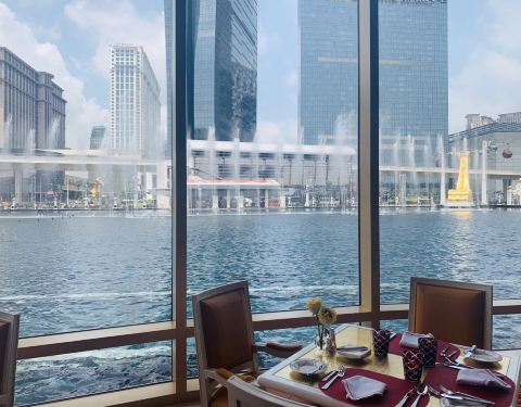 永利皇宫咖啡苑装修华丽精致,透过落地窗可观赏人工湖景及定时音乐喷泉,面对着永利皇宫的喷泉,景色...
