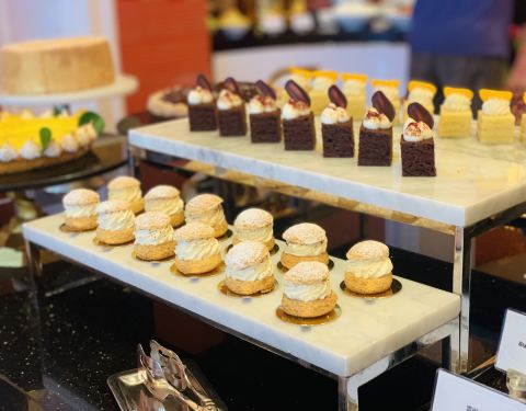 ...正好正对着,可以喝自助下午茶,很多的蛋糕品种,也有一点点海鲜,人均一百多还是挺实惠的,景色很美