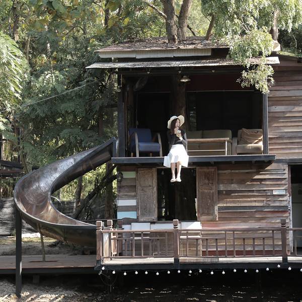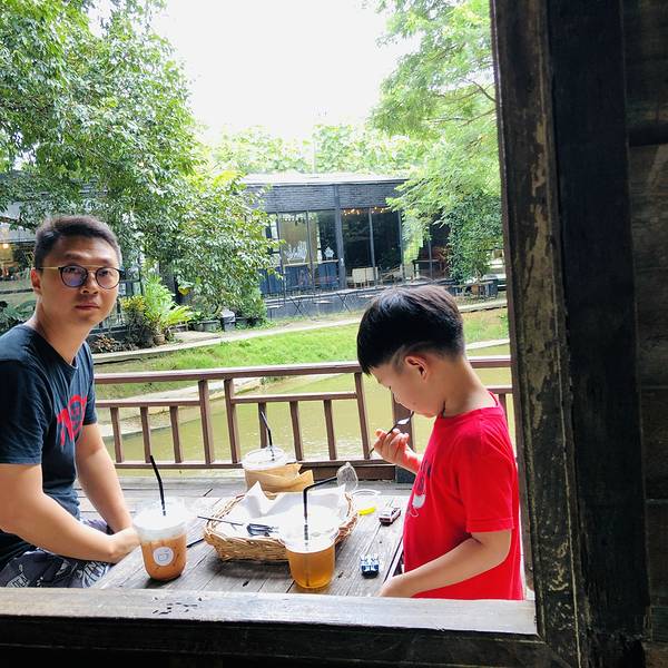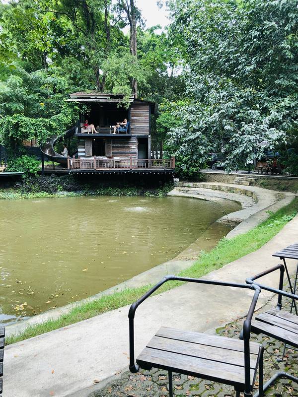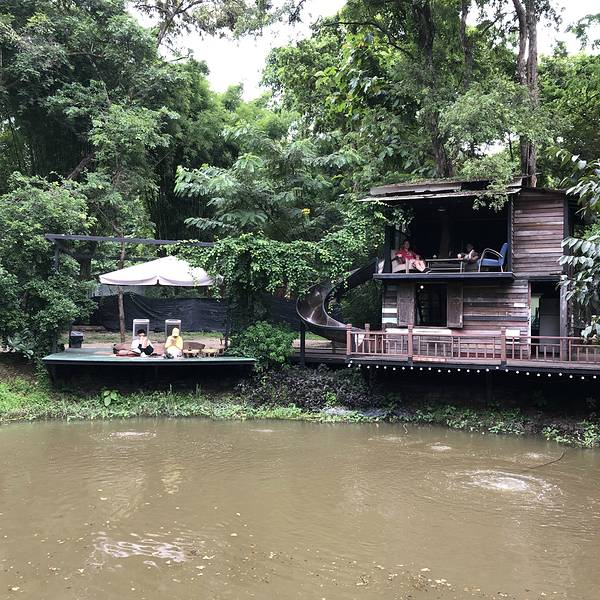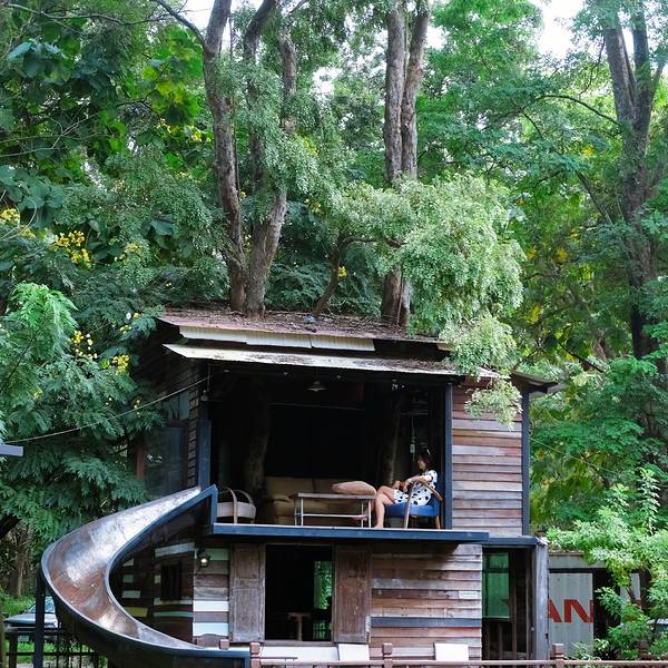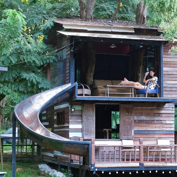 一座木质小屋,一方水塘(我去的时候是黄色的水,后来有朋友去水是绿色的,可能改进了吧),一辆复古小黑车,一只可爱的小奶猫。 这家咖啡店称真的很独特,在郊外的一片树林中,远离喧闹。 室外和室内都有可以坐的椅子,正中心是一座小木屋,旁边还有遮阳伞,可以坐在毯子上舒舒服服享受甜点饮料。 顾客们都会依次上小木屋拍照,玩一玩有趣的铁皮滑梯。Tips: 1、开门时间:9:30-19:00。建议与chom cafe行程安排在一起,两个咖啡店是一个方向。先来这里,再去chom cafe,正好吃午饭。 2、消费很合理,一块蛋糕+一杯牛奶180泰铢。这里的热牛奶,强烈推荐,很好喝,慰藉了没有吃早餐的胃。快速吃完,不然会吸引很多蚂蚁上桌偷吃。
