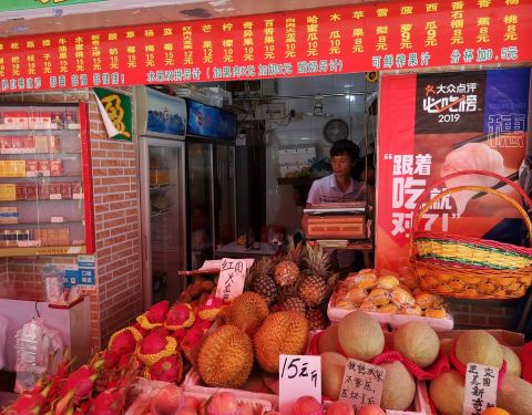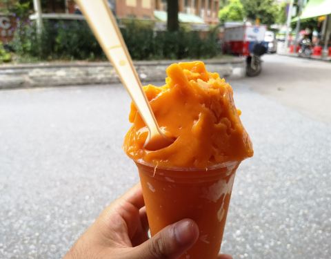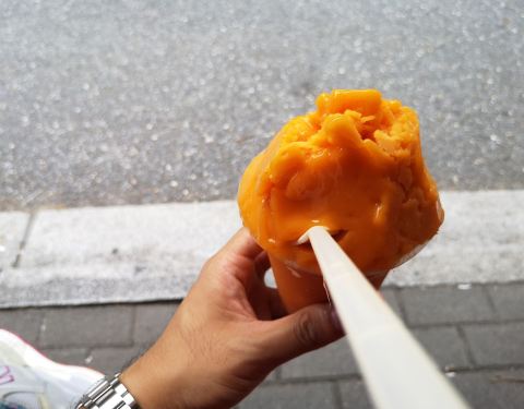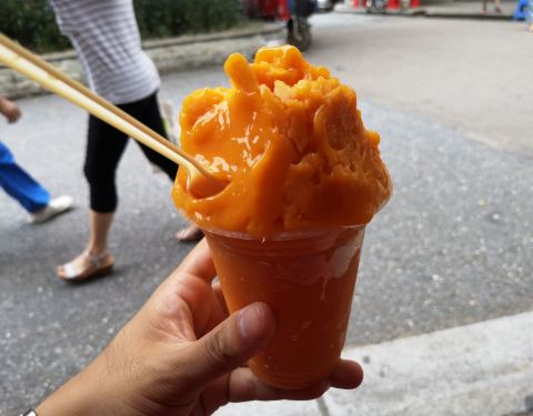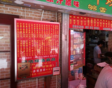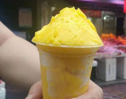 就在旧居附近,母校的正对面,这几年比较火的一个店铺,每次经过都很多人在这里排队买东西的,一直都很好奇,为什么这么多人,估计是因为这边真的是很好吃的。 这次趁着过来,附近就铁下心要吃一下,也管不了人多人少了,不过这次过来真的是很幸运,前面只有一个人在等,买下之后,等了大约几分钟就吃上了,有优惠,还是挺划算。 芒果沙冰份量够,真的是多到要流出来了,而且的话都是用真正芒果弄出来的,芒果丝都在,真材实料,不过有点太甜,腻了,喝不完,总体的确好,怪不得多人排队,名不虚传! 旁边的水果也是特别的新鲜,现在甚至还卖上了鸡蛋仔。