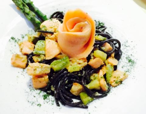 酒也非常好喝。口感十分浓厚,吞拿鱼黑墨汁意面口感带一点点酸。我喝了一款起泡酒口感很顺,而且很香
