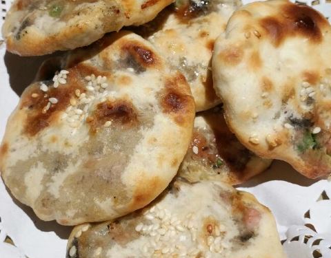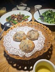 老阿爸碳炉烤饼,这道是典型的浙江衢州菜,梅干菜肉的,一个个小圆饼,一口咬上去外酥里嫩,搭配着梅干菜和肉的香味,一个字——绝!