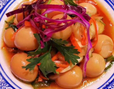 叫花鸭,这是一道很有仪式感的菜品,服务员两个人抬着轿子敲锣打鼓把一锅野鸭抬上来,开锅的客人会有好的彩头,因为服务员会说很多吉祥话来道贺。