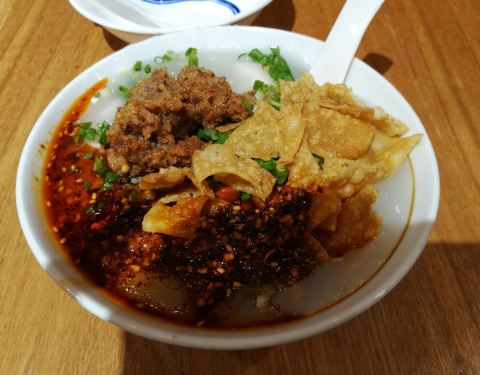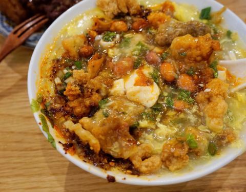 又是我来四川一大新天的豆腐脑。北方的豆腐脑,豆腐脑本身为主,汤底为辅,甚至没有,四川加的料更丰富,北方一般只有卤子。而乐山,就是豆腐脑的胜地。来之前,找了很多豆腐脑店,这家可以说是异类。区别于绝大多数苍蝇馆子,这家实在是一股清流,很时尚的咖啡店的样子,吃着环境很安逸。而最吸引我的,就是“冲蛋”。天啊,不可思议,但想想就觉得无与伦比,吃到嘴里,就是想象中的味道,满足感爆棚。我们点了一份鸳鸯,一份酥肉。粉蒸牛肉和肥肠很结实,酥肉很脆,裹着豆腐脑,复合的口感很美丽。唉,感觉乐山真是美食的天堂。
