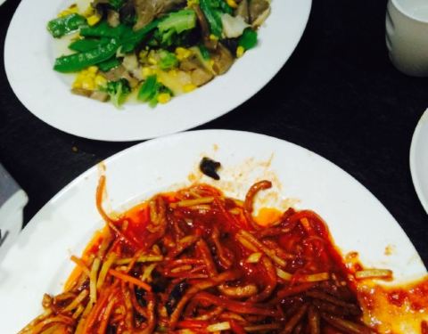 菜品以东北菜和呼和浩特本地菜为主,口味好,份量大,价钱上也不贵。一家东北菜馆儿,人气也挺旺的