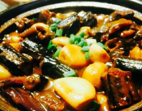 生意极好。提早一天定的座位,据说每天要翻三次台。朋友认识老板娘,听说宜兴的糖芋头有名,虽然不是季节老板也搞来一盘,担心不是应季不入味还没收钱♛。【糖芋头】。原来是小芋头做的,不是应季果然发挥就不稳定,有的很糯很入味,有的就不太行。【红烧芋头】。好吃爆了。超级糯。【乌米饼】。乌米饭做成小饼拿油煎过,很香很可口。【鸡爪煲】。咸淡刚刚好,好评。【蒸馄饨】。野菜馅的,很香很鲜。【清炒红苋菜】。也算是应季蔬菜吧,可口。【大狮子头青菜汤】。狮子头不腻很香,青菜也嫩的。【豆腐煲】。豆腐是老百姓家里收上来的自制豆腐,爽口。