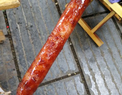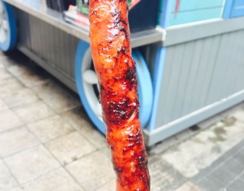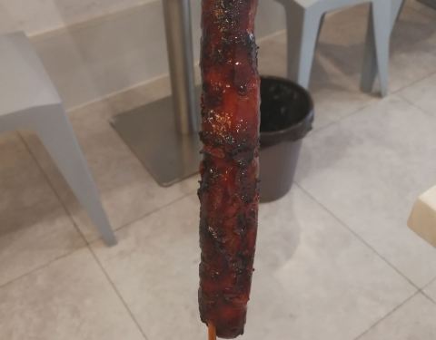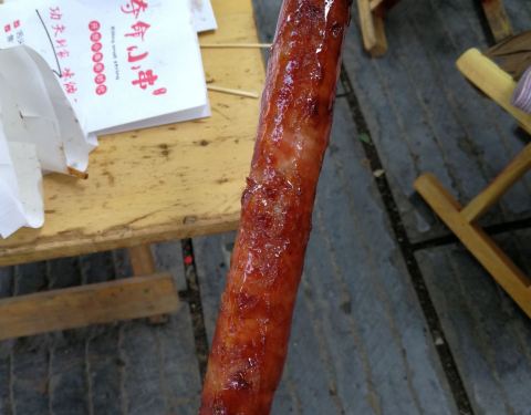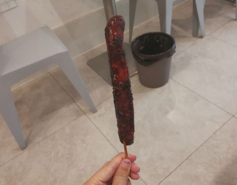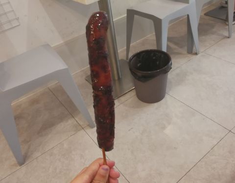无意中逛泰华城商业街遇到这条街排队最长的。位于商业街中间位置,一根肠10元,一开始觉得会略贵,但试过之后确实觉得不亏。店里两个员工,倒替做,因为看起来真的好累好辛苦。手一直夹肠翻肠没闲下来。怪不得招聘店员的工资那么高??。排队期间听到路过的行人说,原来这个有名的肠在这里呀。网上都推荐,更加勾起了我的好奇心和食欲。稍不翻肠就会糊,我的就有些,因此有的边边会有点苦,但因为外面刷的特制的佐料是香甜的。有种我做的可乐鸡翅的样子??。趁热吃超级棒。香喷喷但不油腻。肉质非常棒,肥瘦相间。吃了两根表示没有吃够。看来以后要经常过来吃了。