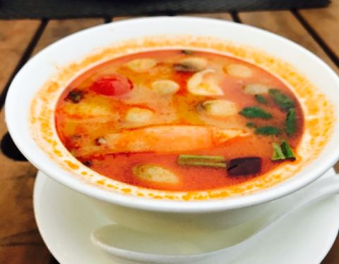位置比较好找,就在大信海鲜城二楼。室外的就餐原本是很有feel的,不过太热了还是选择了进去室内就餐??。两人吃,点了三样东西,冬阴功汤一个份,青咖喱鸡,黄金虾饼,味道还可以吧(最开心的就是冬阴功汤)青咖喱伴着饭吃还是不错的,虾饼不够好吃,应该是虾新鲜吧。看评价说有进去就有虾片送,可是并没有,我不知道是什么原因咯,人均70+。